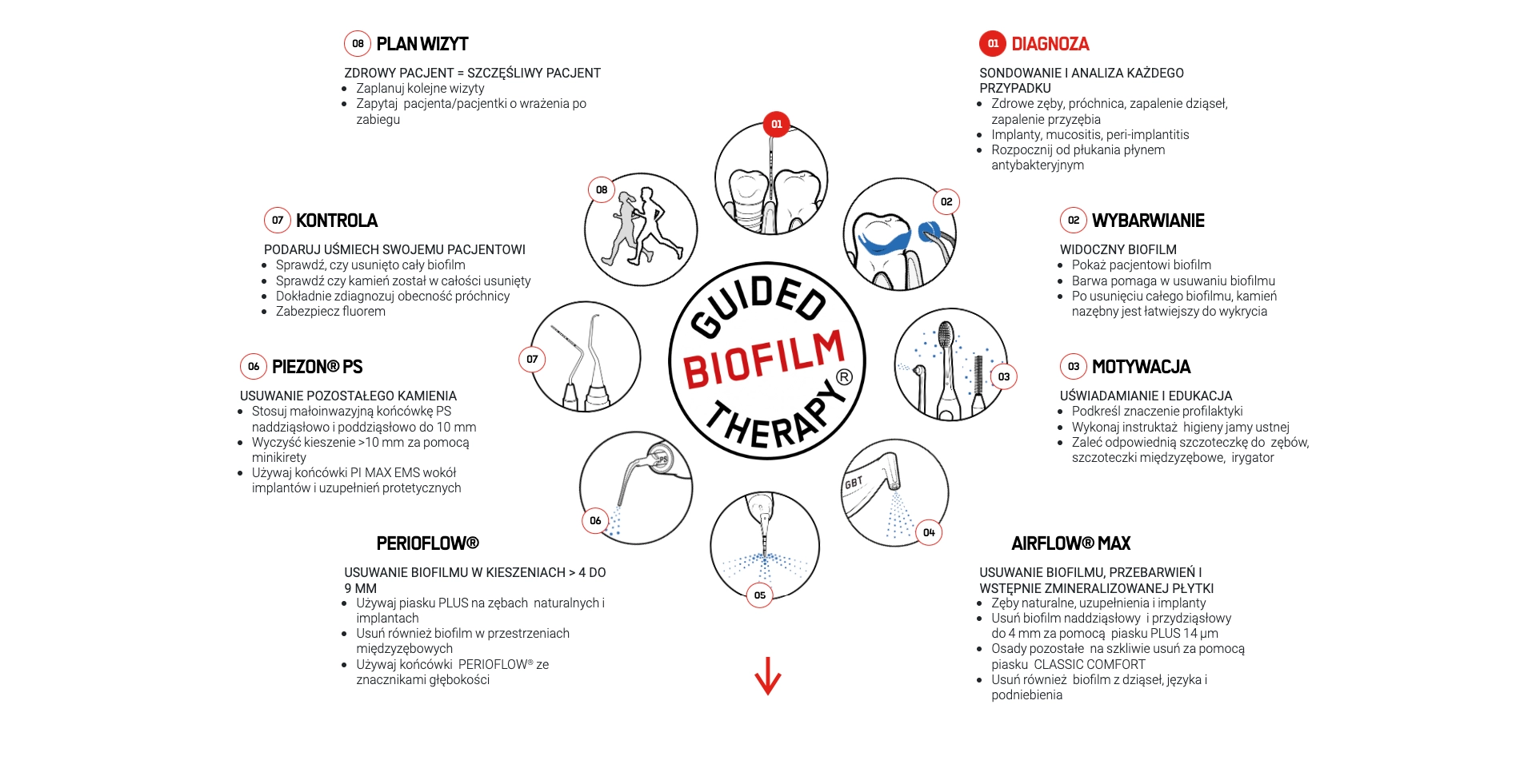 Guided Biofilm Therapy obejmuje protokoły zabiegowe oparte o indywidualną diagnozę i ocenę ryzyka pacjenta dla uzyskania optymalnych rezultatów. Leczenie jest prowadzone w sposób minimalnie inwazyjny, przy zachowaniu maksymalnego poziomu komfortu, bezpieczeństwa i skuteczności.